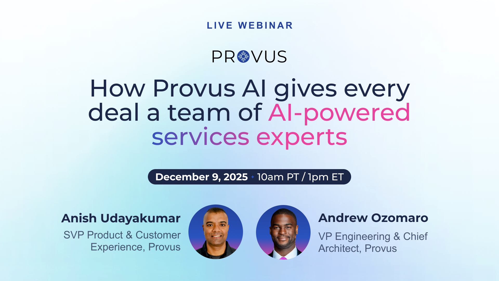 In a recent webinar, Anish Udaykumar, SVP of Product Management and Customer Experience at Provus, and Andrew Ozomaro, VP of Engineering and Chief Architect, shared how Provus AI was built to support sellers directly in the flow of work by embedding agentic AI into services quoting.